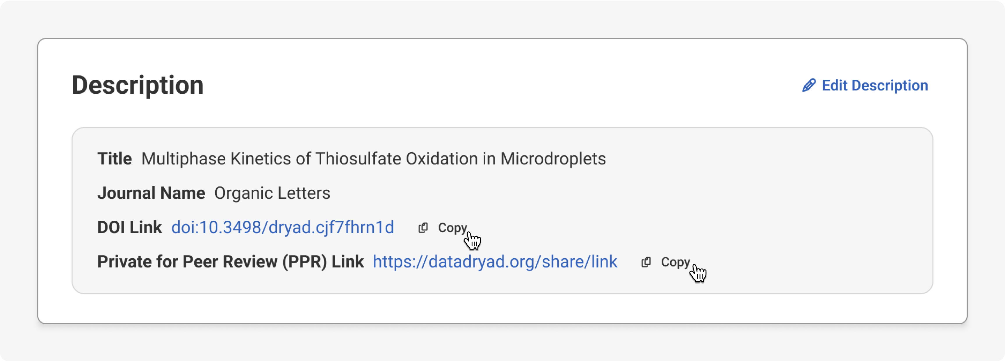 Repeat the above copy and paste steps for DOI link as well. You must share the DOI as part of your data availability statement when submitting your manuscript to the journal.