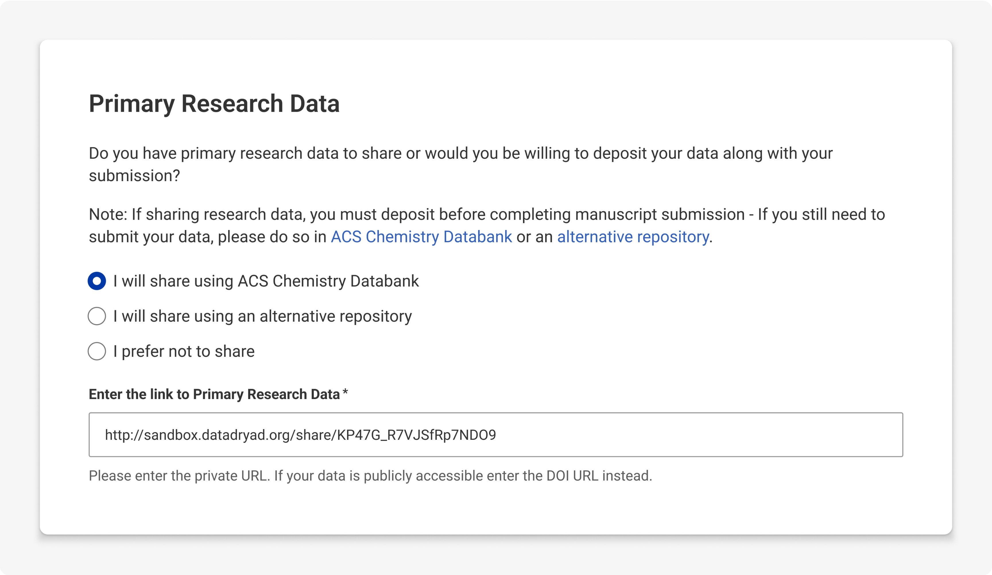Share the Primary Research Data link along with the manuscript submission in ACS Publishing Center